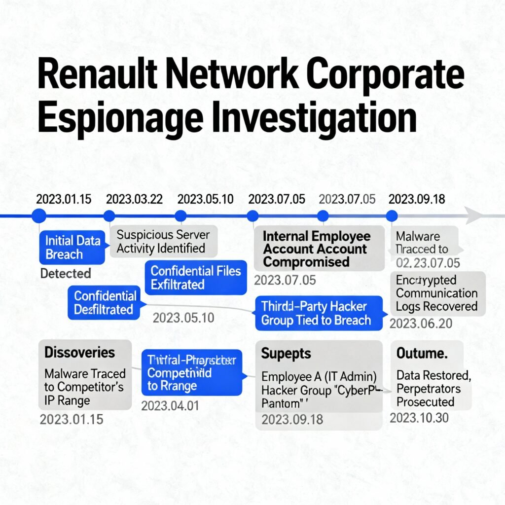 infographic timeline showing events from the corporate espionage investigation code-named Renault Network