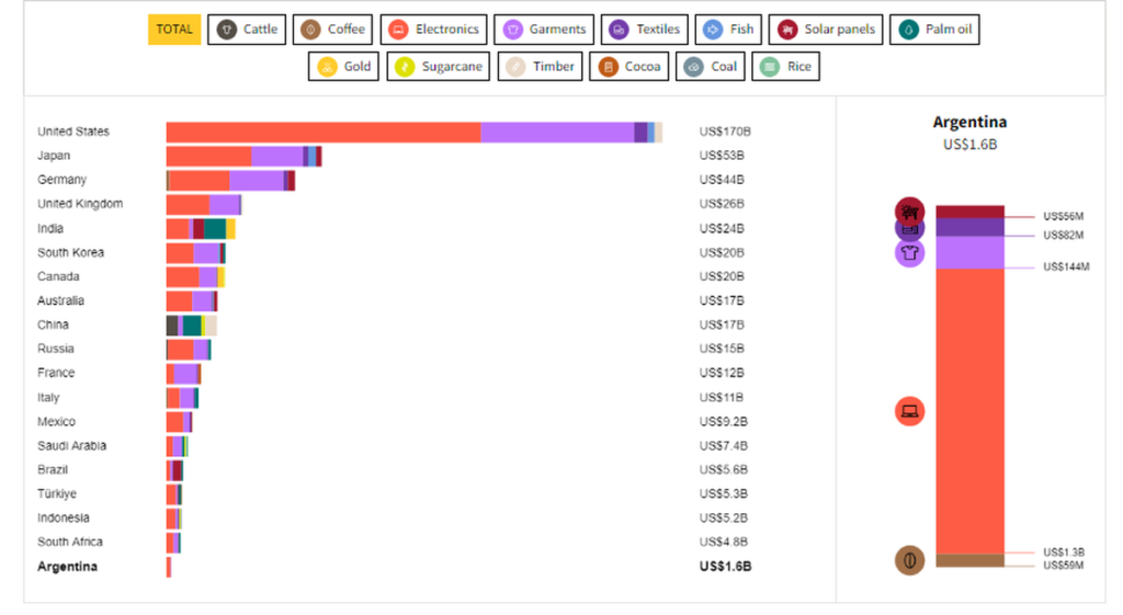 This bar chart illustrates the enormous scale of risky imports where G20 countries import $148 billion of apparel and $13 billion of textiles that may involve forced labour. The disparity underscores how garments dominate the trade of goods susceptible to exploitation. Because apparel production involves many labour‑intensive stages, the potential for forced labour is higher than for textiles alone.